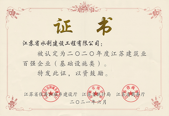 江蘇建筑業百強企業2022年度證書